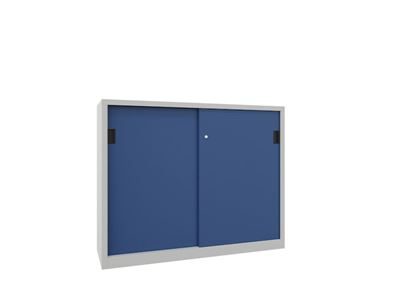 BeskrivningVerkstadsskåp med skjutdörrar för tung belastning Ellinor, höjd 1200 mm, dörrar helt i plåt, BxD 1500 x 600 mm, med skiljevägg och 2 x 2 hyllplan, dörr gentianablå