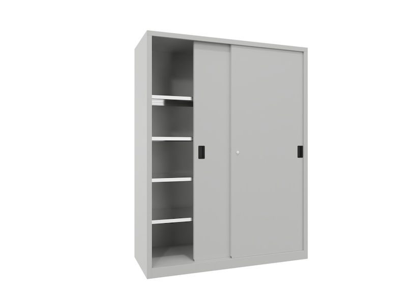 BeskrivningVerkstadsskåp med skjutdörrar för tung belastning Ellinor, höjd 1950 mm, dörrar helt i plåt, BxD 1500 x 600 mm, med skiljevägg och 2 x 4 hyllplan, dörr ljusgrå