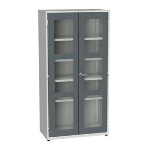 Verktygsskåpet är utrustat med ställfötter som underlättar placering på ojämna golv. Dörrarna har en rejäl 3-punkts espanjolettlåsning och går att få med cylinderlås eller elkodlås. Vid beställning med elkodlås så levereras dessa separat och monteras i efterhand.