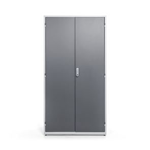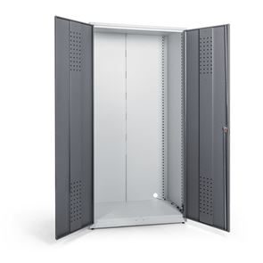 Verktygsskåpet är utrustat med ställfötter som underlättar placering på ojämna golv. Dörrarna har en rejäl 3-punkts espanjolettlåsning och går att få med cylinderlås eller elkodlås. Vid beställning med elkodlås så levereras dessa separat och monteras i efterhand.