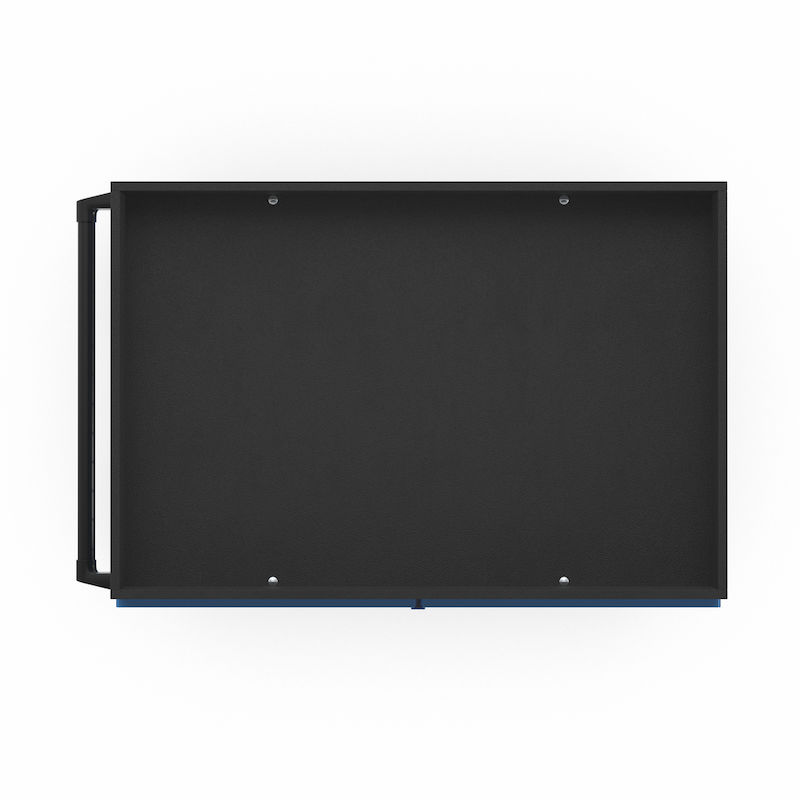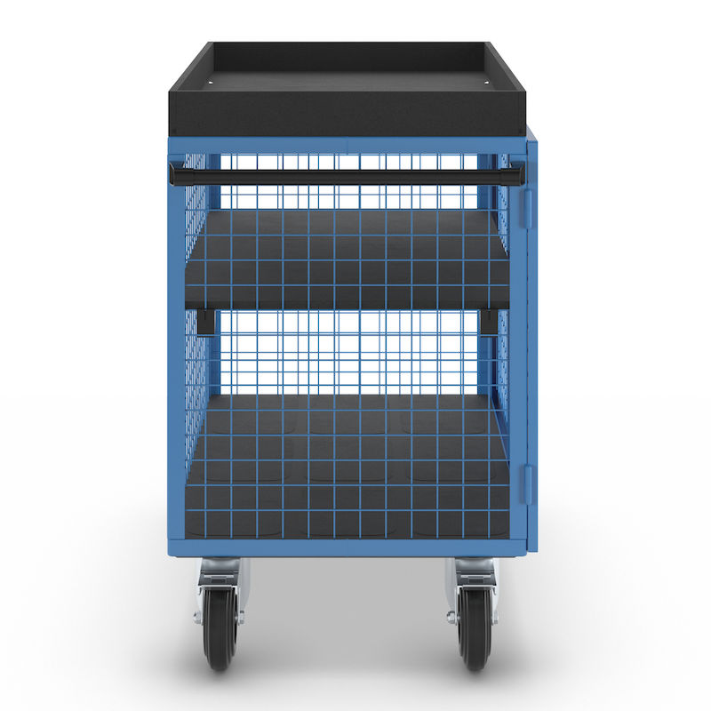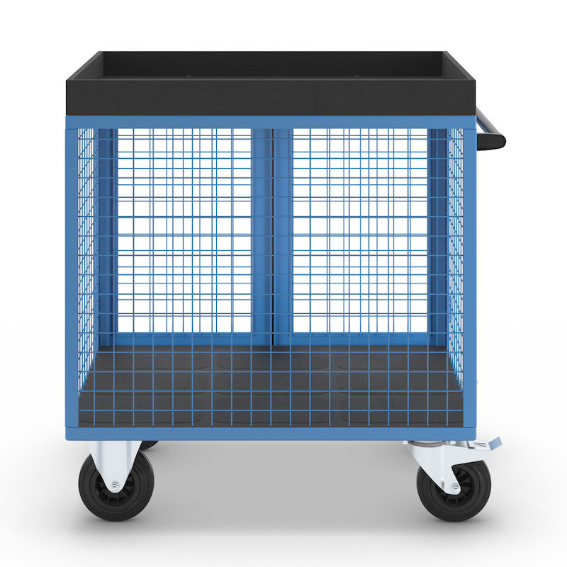 Verkstadsvagn Indra, front och långsidor av stålgaller, utan hyllplan. Robust stålkonstruktion, med lätt och bekvämt skjuthandtag. Pulverlackerad i ljusblått RAL 5012 som standard.